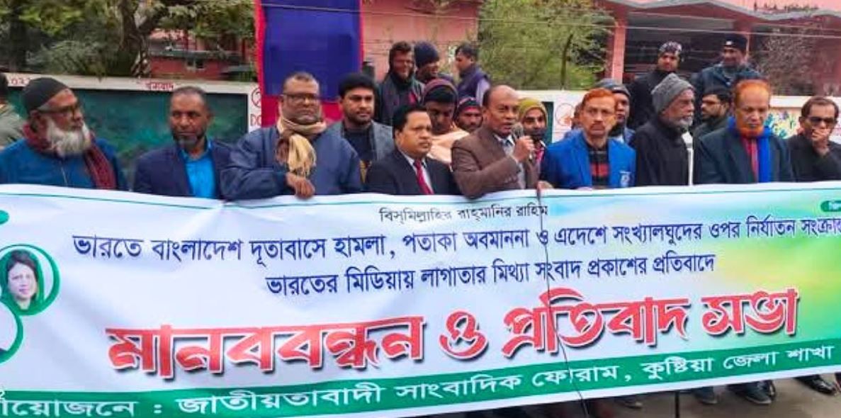 ভারতে বাংলাদেশ দূতাবাসে হামলা-অগ্নি সংযোগ, জাতীয় পতাকা অবমাননা ও এদেশে বসবাসরত সংখ্যালঘুদের উপর নির্যাতন সংক্রান্ত মিথ্যা খবর লাগাতার ভারতীয় মিডিয়ায় প্রকাশের প্রতিবাদে জাতীয়তাবাদী সাংবাদিক ফোরাম কুষ্টিয়া জেলা শাখার উদ্যোগে মানববন্ধন ও প্রতিবাদ সভা অনুষ্ঠিত হয়েছে।