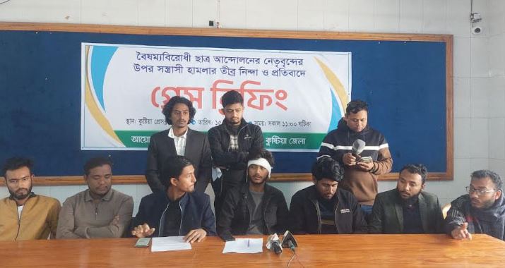 এদিকে, হামলার ঘটনায় রবিবার (১৫ ডিসেম্বর) সংবাদ সম্মেলন করেছে বৈষম্যবিরোধী ছাত্র আন্দোলনের নেতারা। তারা হামলায় জড়িতদের গ্রেপ্তার ও দৃষ্টান্তমূলক শাস্তির দাবি জানিয়েছেন। দুপুর ১২টায় কুষ্টিয়া প্রেস ক্লাবে এ সংবাদ সম্মেলন অনুষ্ঠিত হয়
