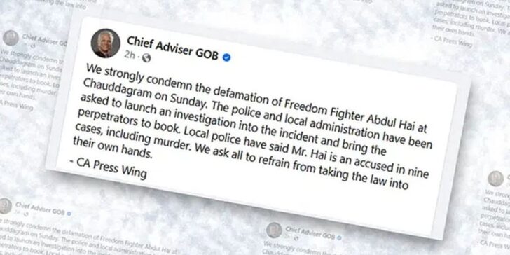 কুমিল্লার চৌদ্দগ্রামে বীর মুক্তিযোদ্ধা আব্দুল হাইকে মানহানির ঘটনায় তীব্র নিন্দা জানিয়েছে প্রধান উপদেষ্টার প্রেস উইং।