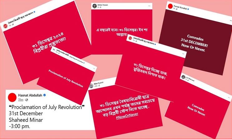 ৩১ ডিসেম্বরকে সামনে রেখে সামাজিক যোগাযোগ মাধ্যম ফেসবুকে একের পর এক রহস্যজনক স্লোগান লিখছেন বৈষম্যবিরোধী ছাত্র আন্দোলন ও জাতীয় নাগরিক কমিটির সদস্যরা। ফলে সেদিন কী হতে যাচ্ছে তা নিয়ে ব্যাপক আলোচনা শুরু হয়েছে।