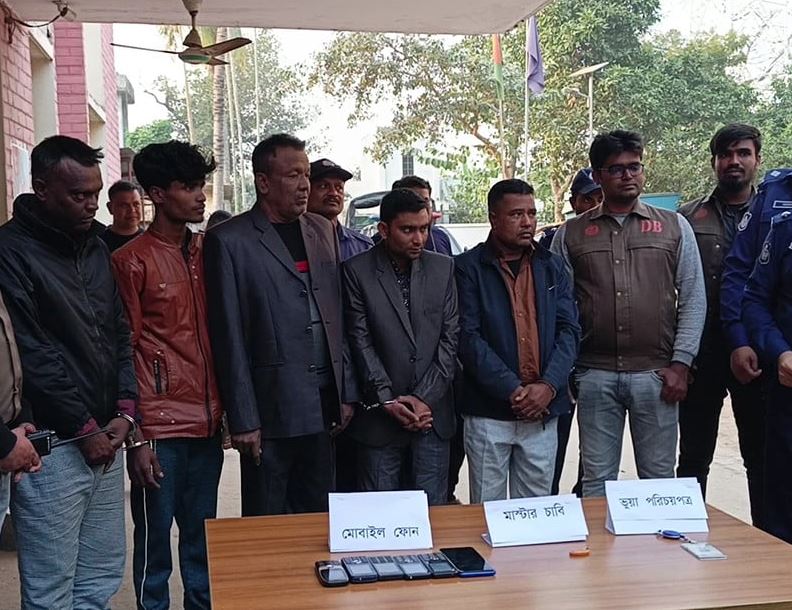গ্রেফতার ব্যক্তিরা হলেন-পটুয়াখালীর বাউফল থানার বিলবিলাস গ্রামের মৃত চান্দু মল্লিকের ছেলে হারুন মল্লিক (৪২), নড়াইলের কালিয়া থানার বিলবাউস গ্রামের আব্দুল লতিফ মোল্লার ছেলে মতিয়ার রহমান মোল্লা (৫৫), নাটোরের সদর থানার পারহাটঘড়িয়া গ্রামের মৃত আজাহার শেখের ছেলে মো. হাসান (৩৫), ফরিদপুরের সদর থানার দক্ষিণ টেপখোলা গ্রামের মৃত বদর উদ্দিন মল্লিকের ছেলে টিটু মল্লিক (৪৫) ও মাগুরার মহাম্মদপুর থানার বালিদিয়া গ্রামের মুরাদ মোল্লার ছেলে শহিদুল মোল্লা (২০)।