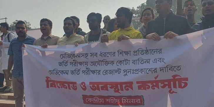 সকল শিক্ষাপ্রতিষ্ঠানের অযৌক্তিক কোটা প্রথার নিরসন ও মেডিকেল ভর্তি পরীক্ষার ফলাফল পুনঃপ্রকাশের দাবিতে বিক্ষোভ সমাবেশ করেছেন সর্বস্তরের শিক্ষার্থীরা।