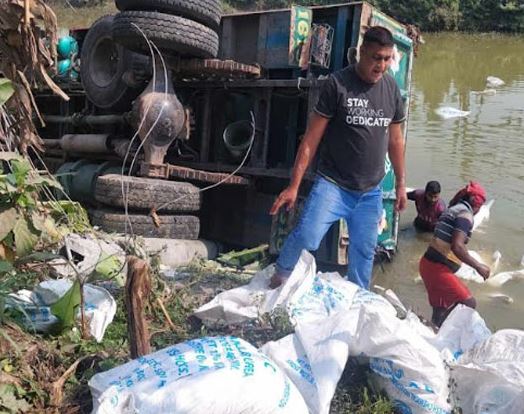 কুষ্টিয়া সদর উপজেলার আলামপুরে ৪০০ বস্তা ইউরিয়া সার বোঝাই একটি ট্রাক নিয়ন্ত্রণ হারিয়ে খালে পড়ে গেছে।