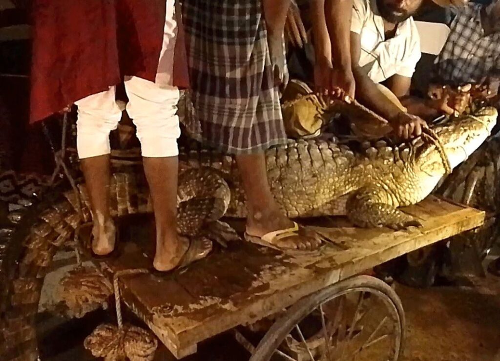 প্রত্যক্ষদর্শী ও স্থানীয়রা জানান, কুমিরটি গড়াই নদী থেকে প্রায় ৪০০ ফুট উপরে ৬ নম্বর ওয়ার্ডের ইউপি সদস্য খিলাফত মিয়ার বাড়ির দিকে যাচ্ছিল। সে সময় কুমিরটি পাতার উপর দিয়ে যাওয়া অবস্থায় খড়-মড় আওয়াজ শোনা যাচ্ছিল। এরপর মাছ ধরা জাল দিয়ে কুমিরটিকে ঘেরাও করে ধরে ফেলে তারা। পরে কুমিরটিকে মজবুত করে বেঁধে এলাকায় আনন্দ মিছিল করে এবং এটি দেখার জন্য কয়েক হাজার মানুষ ভিড় জমায়।