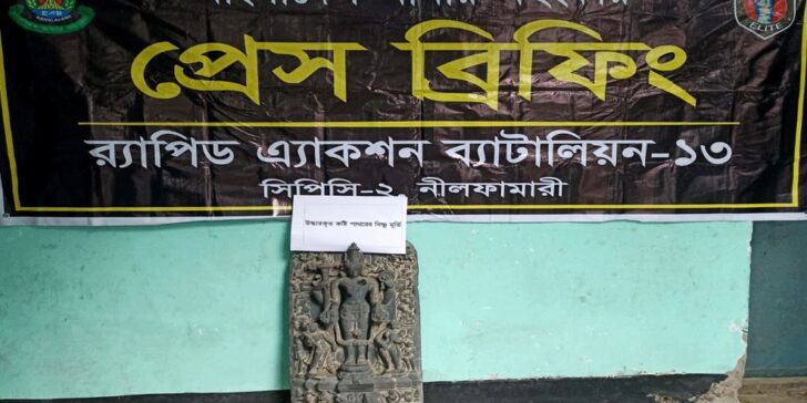 বিজ্ঞপ্তিতে বলা হয়, র্যাব-১৩ ক্রাইম প্রিভেনশন কোম্পানি-২ নীলফামারীর একটি দল গোপন সংবাদের ভিত্তিতে ওই এলাকার গাধোয়া পুকুর সংলগ্ন মুকুল নামের এক ব্যক্তির বাড়ির উঠানে অভিযান চালিয়ে কষ্টিপাথরের মূর্তিটি উদ্ধার করে। এ সময় আবু বক্কর ছিদ্দিক নামে ওই যুবককে আটক করা হয়।