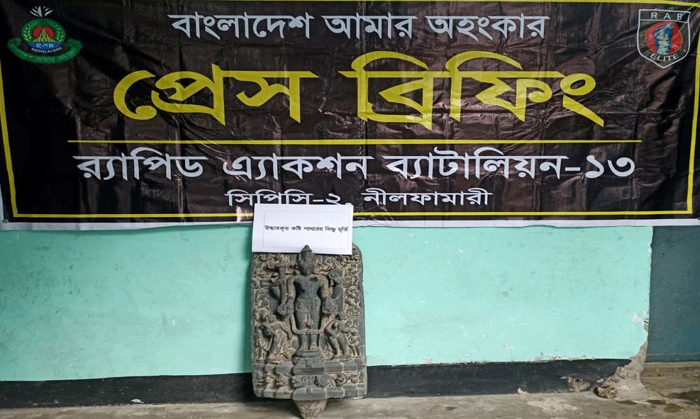 বিজ্ঞপ্তিতে বলা হয়, র্যাব-১৩ ক্রাইম প্রিভেনশন কোম্পানি-২ নীলফামারীর একটি দল গোপন সংবাদের ভিত্তিতে ওই এলাকার গাধোয়া পুকুর সংলগ্ন মুকুল নামের এক ব্যক্তির বাড়ির উঠানে অভিযান চালিয়ে কষ্টিপাথরের মূর্তিটি উদ্ধার করে। এ সময় আবু বক্কর ছিদ্দিক নামে ওই যুবককে আটক করা হয়।