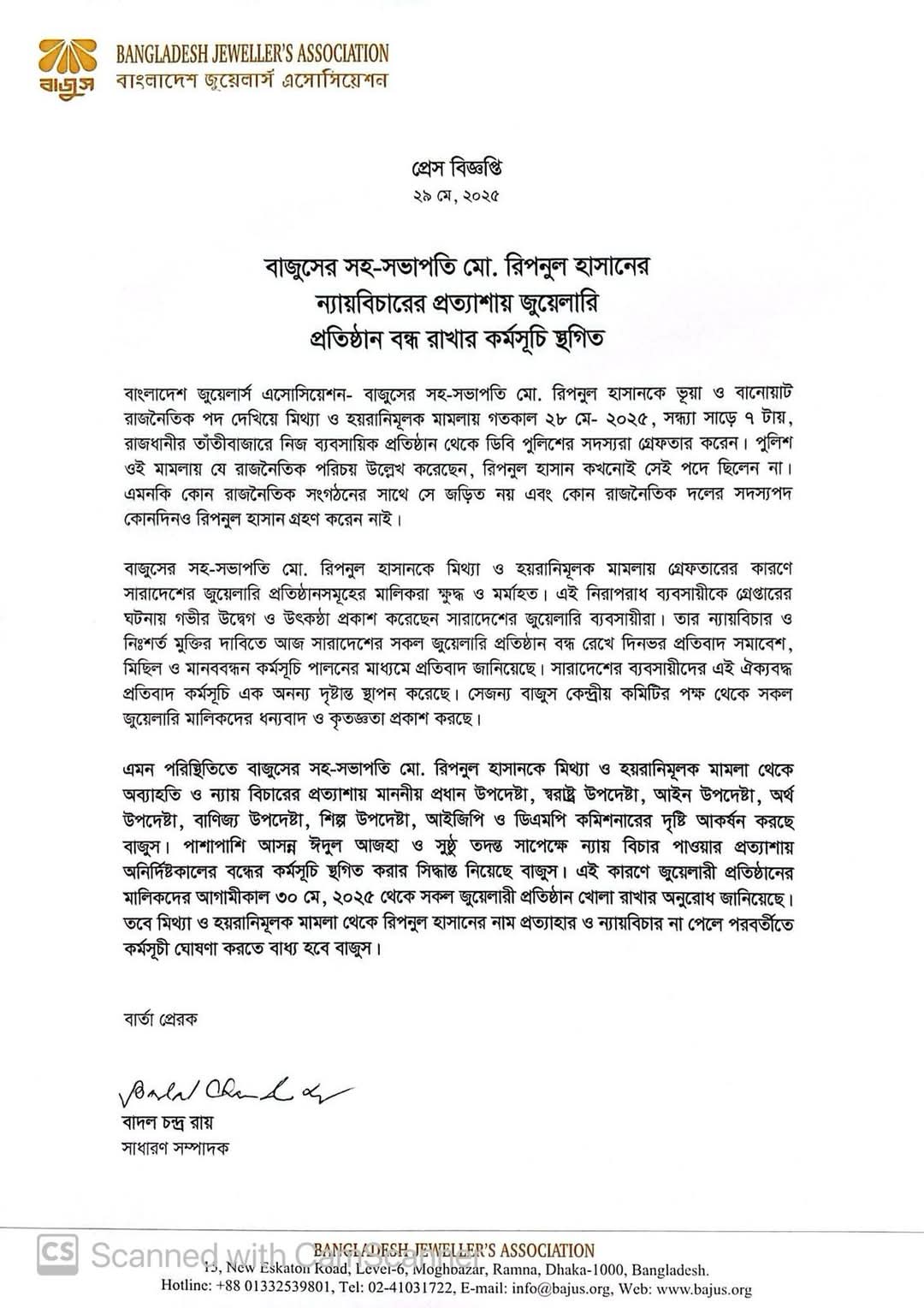 এমন পরিস্থিতিতে বাজুসের সহ-সভাপতি মো. রিপনুল হাসানকে মিথ্যা ও হয়রানিমূলক মামলা থেকে অব্যাহতি ও ন্যায় বিচারের প্রত্যাশায় মাননীয় প্রধান উপদেষ্টা, স্বরাষ্ট্র উপদেষ্টা, আইন উপদেষ্টা, অর্থ উপদেষ্টা, বাণিজ্য উপদেষ্টা, শিল্প উপদেষ্টা, আইজিপি ও ডিএমপি কমিশনারের দৃষ্টি আকর্ষণ করছে বাজুস। পাশাপাশি আসন্ন ঈদুল আজহা ও সুষ্ঠু তদন্ত্ম সাপেক্ষে ন্যায় বিচার পাওয়ার প্রত্যাশায় অনির্দিষ্টকালের বন্ধের কর্মসূচি স্থগিত করার সিদ্ধান্ত নিয়েছে বাজুস।