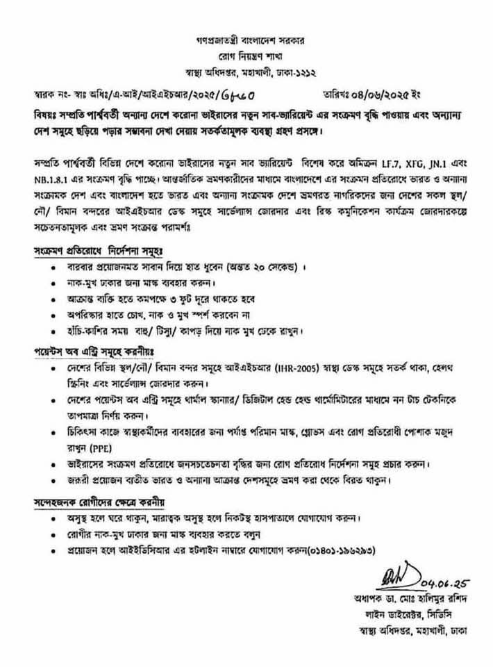 এতে বলা হয়, সম্প্রতি কোভিড-১৯ সংক্রমণ হারের ঊর্ধ্বগতি বিবেচনা করে জনসমাগমপূর্ণ এলাকায় সবাইকে মাস্ক পরার জন্য অনুরোধ জানিয়েছে স্বাস্থ্য ও পরিবার কল্যাণ মন্ত্রণালয়। বিশেষত বয়স্ক ও অসুস্থ ব্যক্তিদের স্বাস্থ্য ও পরিবার কল্যাণ মন্ত্রণালয়ের পক্ষ থেকে এ ধরনের স্থান এড়িয়ে চলার পরামর্শ দেওয়া হয়েছে।