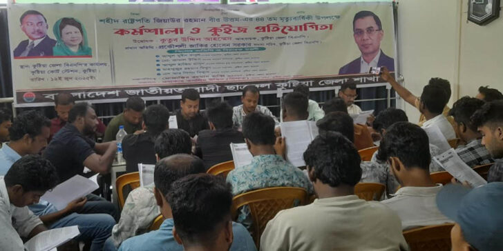 শহীদ রাষ্ট্রপতি জিয়াউর রহমানের ৪৪তম শাহাদতবার্ষিকী উপলক্ষে কুষ্টিয়ায় দিনব্যাপী কর্মশালা ও কুইজ প্রতিযোগিতা অনুষ্ঠিত হয়েছে। জেলা ছাত্রদলের আয়োজনে গতকাল সকাল ১১টা থেকে বিকাল ৫টা পর্যন্ত জেলা বিএনপি’র কার্যালয়ে এ কর্মসূচি অনুষ্ঠিত হয়। এতে অংশগ্রহণ করেন ছাত্রদলের প্রায় শ’খানেক নেতাকর্মীরা। প্রথমে শহীদ প্রেসিডেন্ট জিয়াউর রহমানের জীবনের ওপর আলোকপাত করা হয়। এরপর জিয়াউর রহমানের কর্মময় জীবনের ওপর কুইজ প্রতিযোগিতার আয়োজন করে ছাত্রদলের নেতাকর্মীরা।