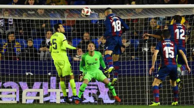বৃহস্পতিবার রাতে শেষ ষোলোর প্রথম লেগের খেলায় শুরুতে পিছিয়ে পড়ে বার্সেলোনা। ম্যাচের চতুর্থ মিনিটে এরিক কাবাকোর গোলে এগিয়ে যায় স্বাগতিক লেভান্তে। বল দখলে এগিয়ে থাকা কাতালানরা গোল পরিশোধ করতে গিয়ে উল্টো গোল হজম করে বসে ম্যাচের ১৮তম মিনিটেই। বোরহা মায়োরালের গোলে ব্যবধান দ্বিগুণ করে লেভান্তে। এর আগে ম্যাচের ১৩তম মিনিটেই ব্যবধান দ্বিগুণ করার সুযোগ হাতছাড়া করে লেভান্তে।