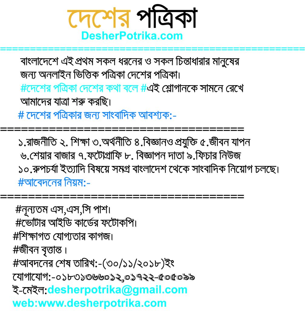 দেশের পত্রিকায় সাংবাদিক নিয়োগ চলছে Md salman 7 years ago দেশের পত্রিকায় সাংবাদিক নিয়োগ চলছে । বিস্তারিত জানার জন্য নিচের ফিচার ইমেজটি দেখুন ।
