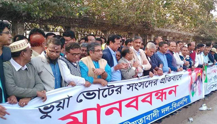 গতকাল মঙ্গলবার রাজধানীর নয়াপল্টনে বিএনপির কেন্দ্রীয় কার্যালয়ে সংবাদ সম্মেলনে রুহুল কবির রিজভী আজকের কর্মসূচির বিষয়টি জানান। এ সময় মানববন্ধন কর্মসূচির ঘোষণা করে তিনি বলেন, ‘একাদশ জাতীয় সংসদের প্রথম অধিবেশন উপলক্ষে এই মানববন্ধন করা হবে।’ রিজভী বলেন, ‘এই কালিমালিপ্ত ভুয়া ভোটের সংসদের প্রতিবাদে কাল (আজ বুধবার) বেলা ১১টা থেকে দুপুর ১২টা পর্যন্ত বিএনপির উদ্যোগে জাতীয় প্রেসক্লাবের সামনে মানববন্ধন হবে।’ তিনি আরও বলেন, ‘এই সংসদ ইতিহাসের ম্যান্ডেটবিহীন ক্ষমতালোভীদের সম্মিলন হিসেবে বিবেচিত হবে সব জায়গায়।’